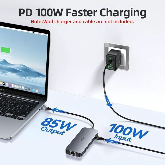 100W Fast ChargingThis Triple Monitor Docking Station features a PD charging port to keep your laptop charged at all times, with an input of 100W and output of 85W. The second USBC port is for data transfer only, not for power supply or monitor expansion