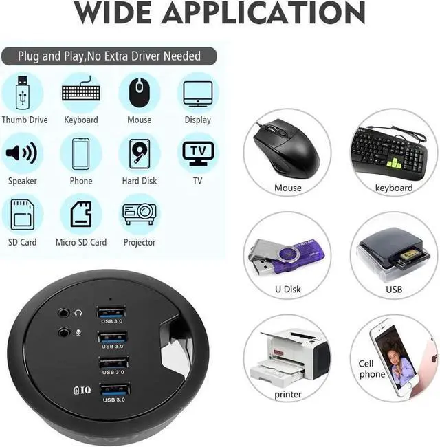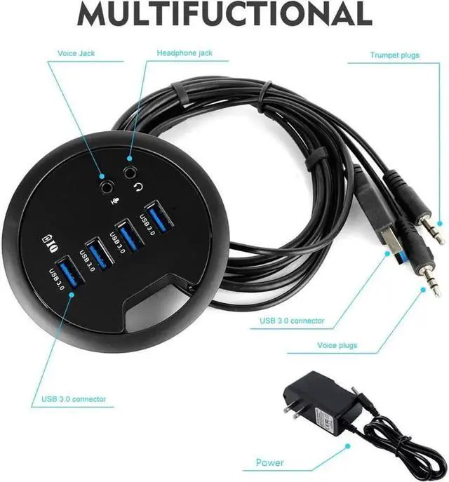 WHY CHOOSE WDX? We provide high-quality products with reasonable price. We have our own factory, professional engineer team and after-sale customer service team. WHY CHOOSE WDX USB 3.0 HUB? ü Dia( 3.62" + 3.07" )*H 0.94". ü 5V/2A power adapter, BC 1.2 Compliant. ü Fit inside 3.14" cavity. ü 2 x Dia 0.14" audio jacks to connect a headset. ü Compatible with Windows and MacOS Linux systems. ü 4 USB 3.0 ports, avoice jack, a headphone jack with 3 cables of USB 3.0 connector (L 29.53 \u201d), voice plug (L 29.53 \u201d) and trumpet plug (L 5.12 \u201d) includedü You can connect your mouse, keyboard, U Disk, USB, Printer, microphone, headphone, etc.