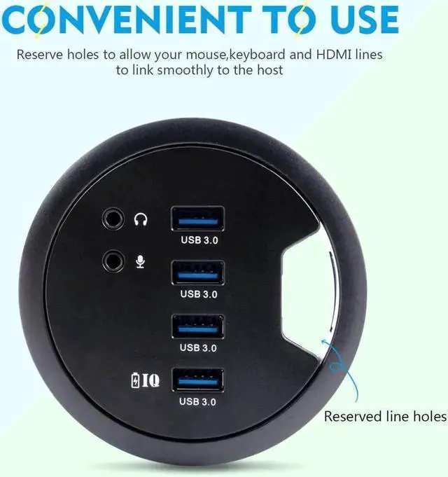 ü The 4 port usb hub with 3.5 mm Audio Mic Phone Jack can charge and transfer data at the same time. ü The compact USB hub reserve a hole to allow your mouse, keyboard or HDMI lines to link smoothly to the host. ü The USB 3.0 connector (L 29.53 \u201d), voice plug (L 29.53 \u201d) and trumpet plug (L 5.12 \u201d)is long enough for your convenient use. ü USB 3.0