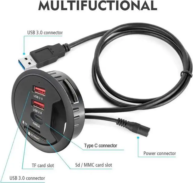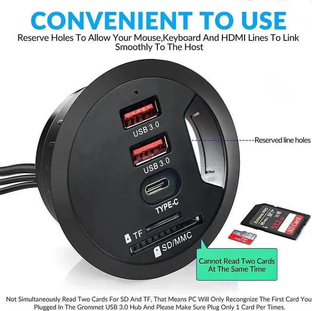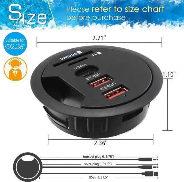 DESKTOP ORGANIZERThis compact USB hub fits inside 2.36" hole on your desk; make full use of computer desk space, and solving the problem of desktop charging and transmission. (Note: It is suitable for PC computer USB interface expansion, the computer input is type-A/F, and the notebook computer needs to be used with a type-C to type-A/F adapter. )