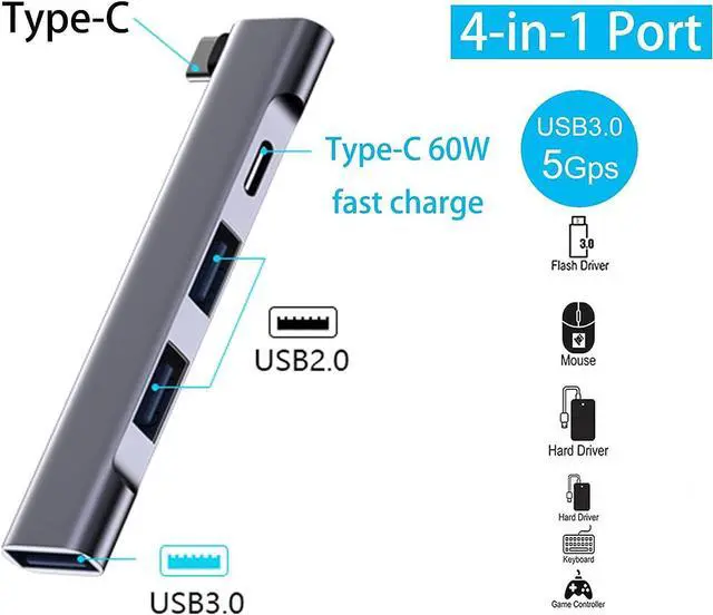 4-Port USB C HubOur USB hub can expand your computer' s 1 USB C port into 1 60W fast charging port (phone charging support up to 18W) + 1 USB 3.0 port + 2 USB 2.0 ports, support simultaneous work. No need to install software or drivers, easy to use.