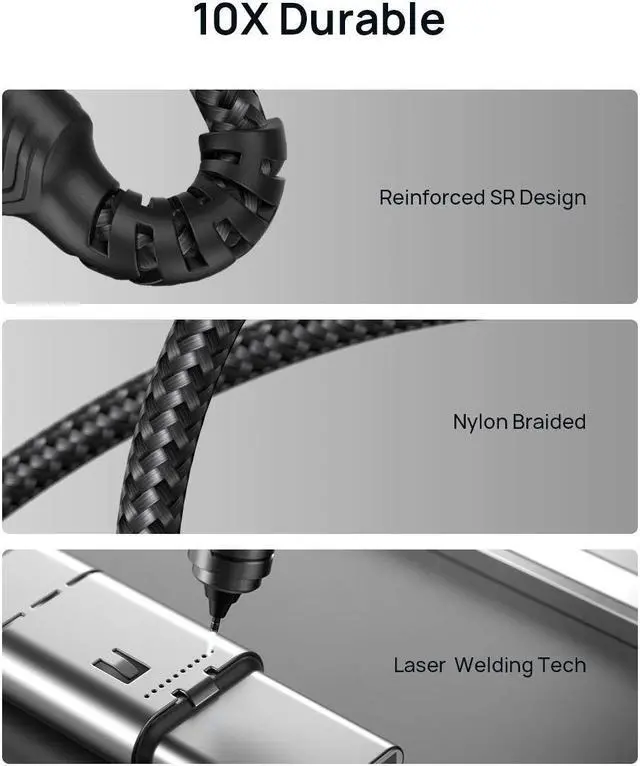 Ultra High Quality Assurance: Upgraded 3D aluminum connector and exclusive laser welding technology, which to ensure the metal part won' t break. Premium nylon braided usb c cord adds additional durability and tangle free. Special Strain Relief design, can bear 15000+ bending test.