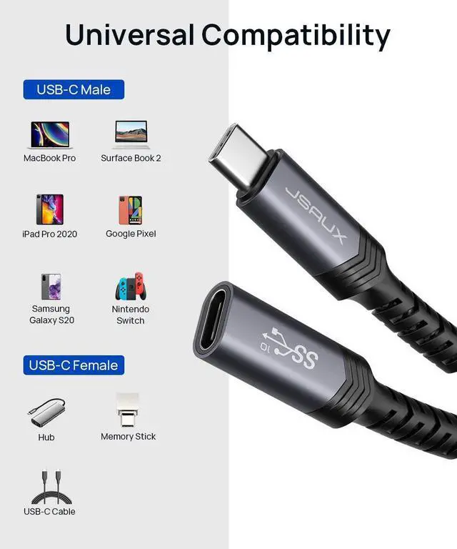 Compatible with Most USB-C built-in devices: The USB C extension cord perfect compatibility with Steam Deck, USB C hub, Mag-safe Wireless Charger, MacBook Pro/Air, iPad Pro/Air, iMac Pro, Surface Go, Galaxy S22/S21/S21 ultra, Google Pixel 6/5/4a, Huawei P50 P30 Pro, multi-port hub/dock, USB-C monitor/display, PD wall chargers etc. (NOTE: This usb c extender does not work with any active Thunderbolt 3 docking stations/ hubs/ cables)