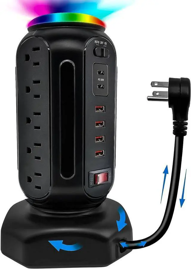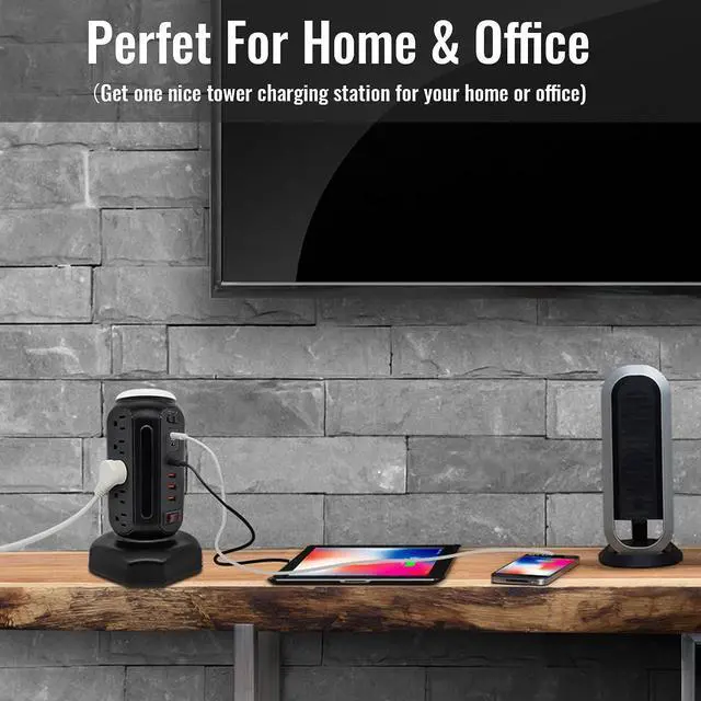 Space Saving Power Strip: The innovative tower shape utilizes the vertical space and allocates the outlets evenly on four sides with them wide-spaced, which is perfect even for large and bulky power plugs and adapters.