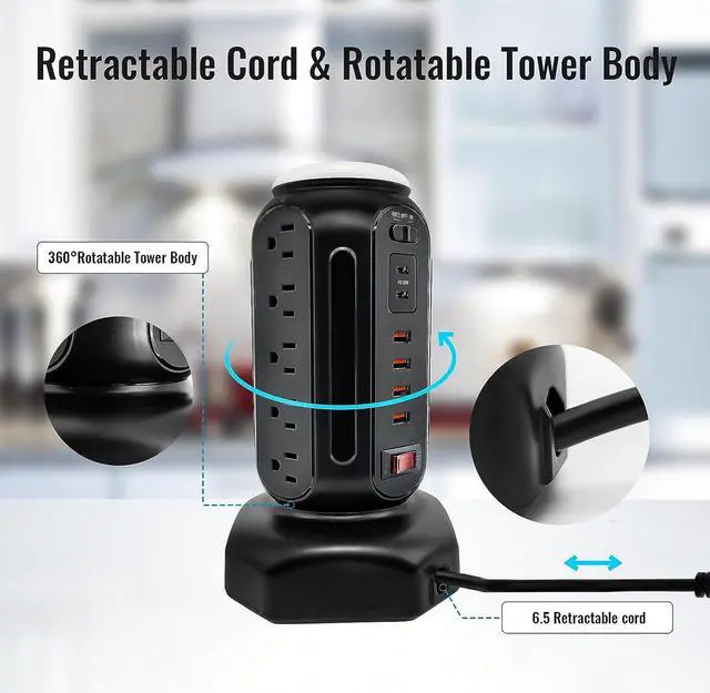 Retractable & Long Extension Cord The retractable cord in the tower base, with which you can pull out the needed length and leave the rest inside for better balance. And the surge protector tower with extra long extension cord 6.5 feet solves the problem of our desk being far from the socket. You can use your device almost anywhere in the room because of the 6.5 feet cord.