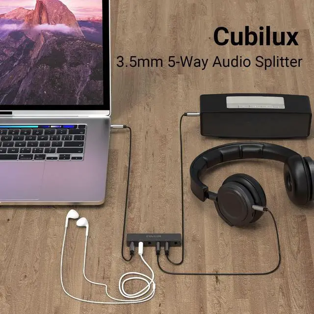 [5 Ports Headphone Splitter] Cubilux aux adapter splits audio into 5 x 3.5 mm auxiliary ports, letting you to hook up multiple headphones or speaker systems to play music at the same time or easily share music with up to 5 friends.