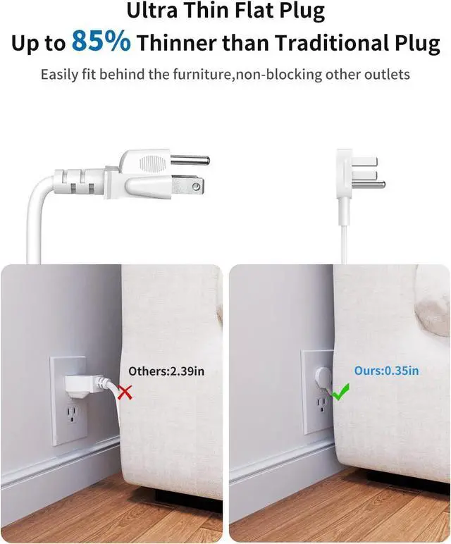 85% Space Saving Flat Plug With only 0.34 inch ultra slim design, the low-profile flat wall plug is 85% thinner than a traditional plug, which can close to the wall easily, and hide in the back of furniture, bed, or refrigerator, no waste for every inch space for your home. The 45-degree angled design doesnt block the bottom receptacle of your duplex wall outlet.
