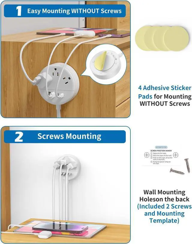 2 Easy Mounting Methods DesignThe mountable power strip is available in two installation options: strong mountable with screws and easy mountable without screws. Free supply of 2 screws, 1 mounting template, and 4 pieces of adhesive sticker pad. So you can mount it on a wall, nightstand, or desk, no more running messy tangled wires down to the floor outlet.