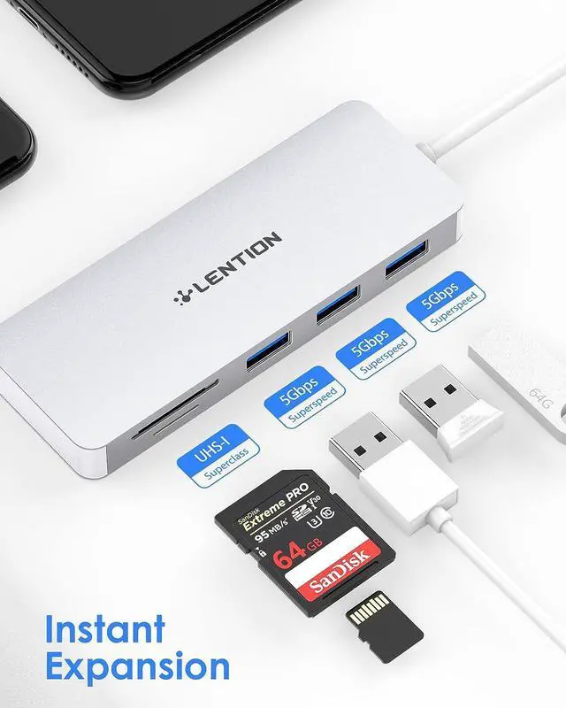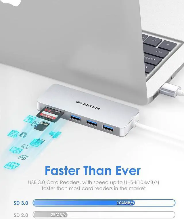 Card Reader: providing speed up to UHS-I (104MB/s), much faster than most card readers in the market. Three USB 3.0 ports with data transfer speed up to 5 Gbp/s