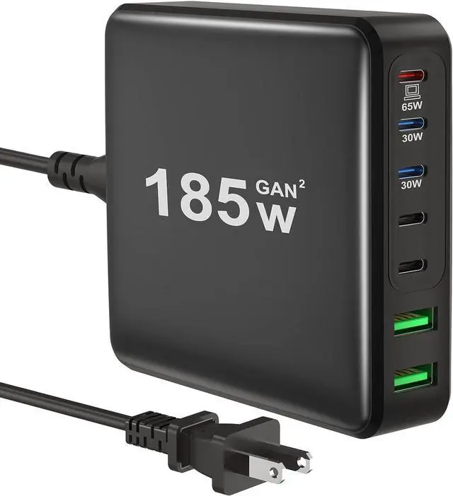 185W USB C Charger This 7-Port USB C charging station with up to a total of 185W power, equipped with 5 USB-C ports and 2 USB-A ports to charge 7 devices simultaneously, such as laptops, iPhone, iPad, Samsung Galaxy, smartphones, tablets, headphones, etc, which is very suitable for home, office, travel, etc. When all ports are used, the charging station provides a maximum power of C1 (65W) + C2/C3 (30W) + C3/C4 (15W) + A1/A2 (15W). Whats cool is the max 65 wattage power enables you can power your laptop/macbook Series.