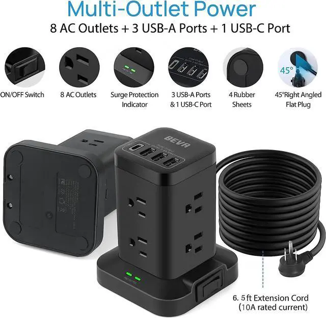 Extension Cord with Multiple Outlets This surge protector power strip tower has 8 outlets, and 4 USB ports which include 1 USB-C port. Wide voltage design of 100V-250V and 10A heavy-duty extension cord. 5V/ 2.4A max output per USB-A port, 5V/3A max output from USB-C port( 5V/ 3.4A in total).