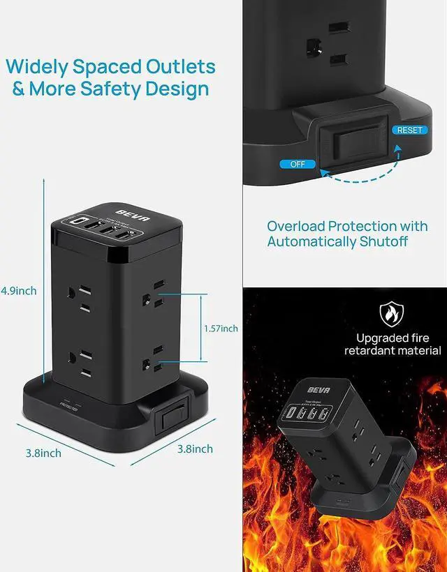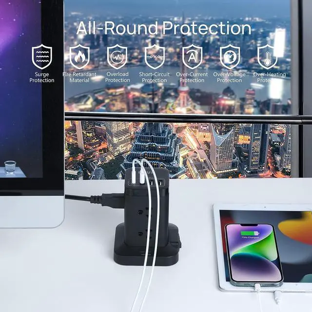 Surge Protector Tower &All-Round Protection Power strip surge protector has passed FCC, UL certification. With 700J surge protection, this USB power strip tower can protect your electronic devices against voltage fluctuations or current fluctuations, such as lightning, spikes, and surges. The reset/off switch with circuit breaker will automatically cut power to protect the devices in case of overcurrent/overcharge/short-circuit/overheating etc.