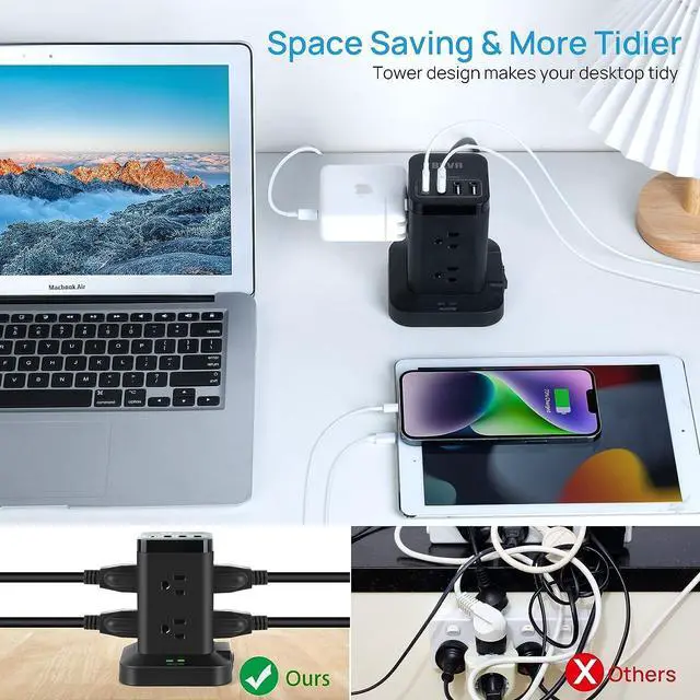 Tidy Desktop & USB Tower Charging Station With the vertical design, it does not take up too much space like a normal power strip when you need to connect multiple devices. The space between the two adjacent AC outlet is 1.57 inches which is large enough for you to plug in 2 big plugs and no longer worry about plugs blocking each other. This power strip tower surge protector makes your desktop more tidy.