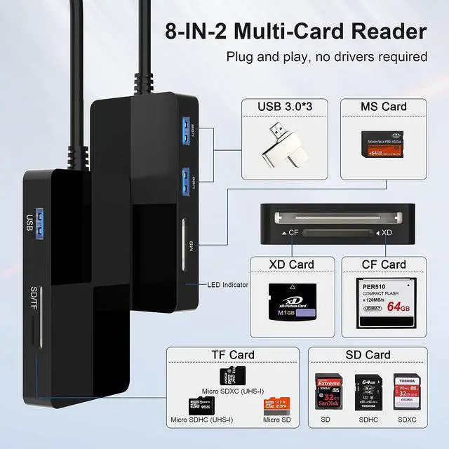 8 in 2 Multi Card Reader with USB HubThis multi-memory card reader includes 1 x XD card slot, 1 x CF card slot, 1 x SD card slot, 1 x TF card slot, 1 x MS card insert and 3 x USB ports slot for your choice, which can meet most of the cards on the market. What' s more, this compact flash card reader can read and write 5 different cards at the same time, and 3 USB devices, which can greatly improve your work efficiency.