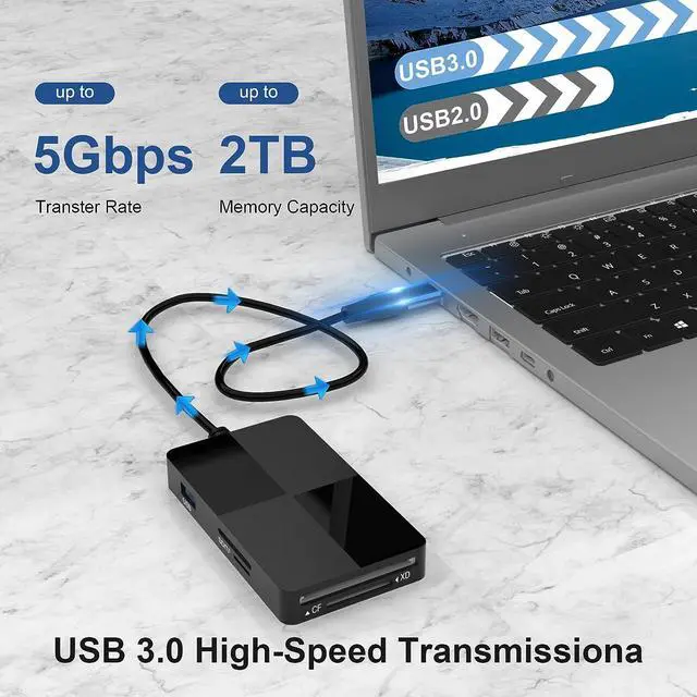 5Gbps Super Speed TransferUSB 3.0 port supports 5Gbps data transfer, you can quickly transfer your files, pictures, audio and video from your card to your phone, computer, tablet, saving a lot of time and improving your work efficiency. Also USB 3.0 card reader is compatible with USB 2.0 / 1.1 port.