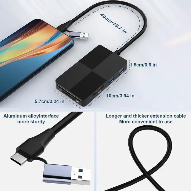 Type C + USB A Multiport Card ReaderThe sony memory stick pro duo adapter takes into account USB A and Type C interfaces, and can be used not only on computers, but also directly on Android phones and tablets. Supported card types include SDXC, SDHC, SD, CF, MS, Micro SDXC, Micro SDHC, Micro SD cards, UHS-I cards, etc. Supported models include Windows XP/Vista/7/8/ 8.1 /10, Chrome OS, Linux, Mac OS, Android, etc.