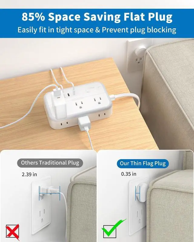 6X Space Saving Upgrade Flat Plug- with only 0.35 inch ultra slim design, the wall flat plug is 6X thinner than traditional plugs, which can close to the wall easily, and fits tight spaces behind the sofa, nightstand, bookshelf, and headboard. Save a lot of space,