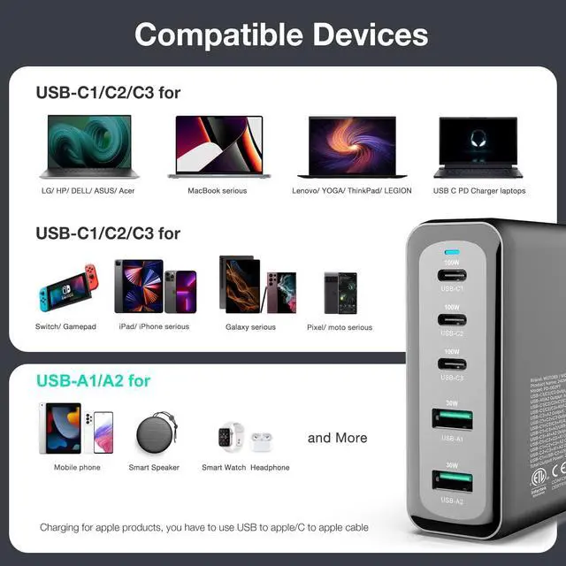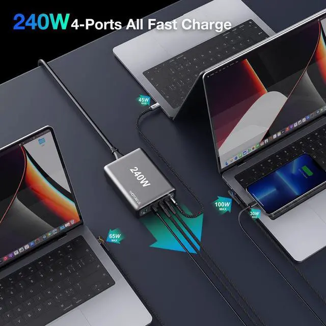 [Fast Charging for 3 Laptops] When using the USB-C ports individually, each of them can reach PD100W maximum. When using all C ports together(C1+C2+C3), this USB C charger plug provides 100W+65W+65W power for 3 different laptops.