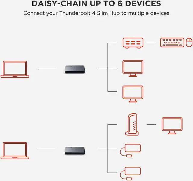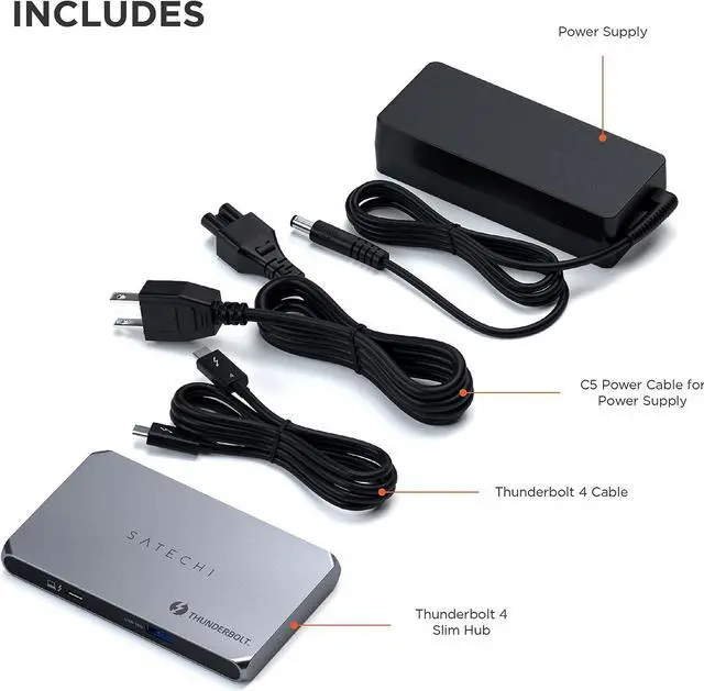 WHATS INCLUDED - Thunderbolt 4 Slim Hub 5-in-1, 100W Power Adapter, C5 Power Cable, 2.6 ft Thunderbolt 4 Cable, User Manual, 1 Year Warranty & Customer Support.