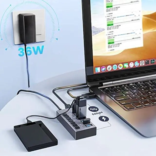 Hub: able to plug in up to 7 devices all on one strip, the USB splitter can charge up to 5V/ 2.4A per port. The included 12V/3A power adapter not only provides fast and safe charging, but also ensures fast and stable data transfer during use.