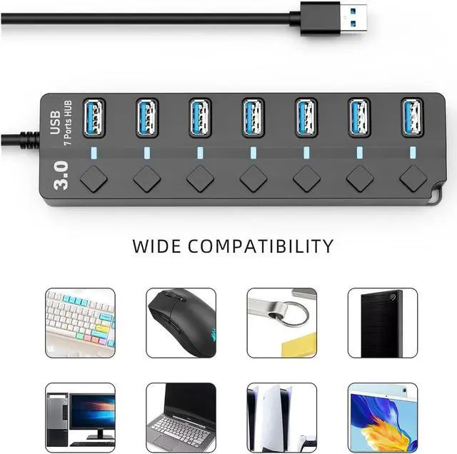 Zell Usb 3.0 Hub, 7-Port Usb Data Hub Splitter With 3Ft Long Cable Usb Extension For Laptop,Pc Computer,Surface Pro, Ps4/5, Flash Drive, Mobile Hdd - With Led Individual On/Off