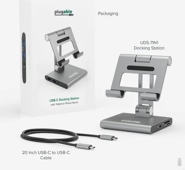 The Little Screen Becomes the Big Screen The Plugable USB-C Docking Station with Tablet Stand or Phone Stand (UDS-7IN1) adds functionality to your Windows tablet, M1 or M2 iPad Air or iPad Pro and USB-C phones and tablets that support DisplayPort Alt Mode, like the Samsung Galaxy devices. Lets start with your screen, when it comes time to get actual work done, the pinch and zoom will only get you so far. Extend to a bigger screen with a 4K 30Hz capable HDMI port. Its like going from fun-sized to full-sized.