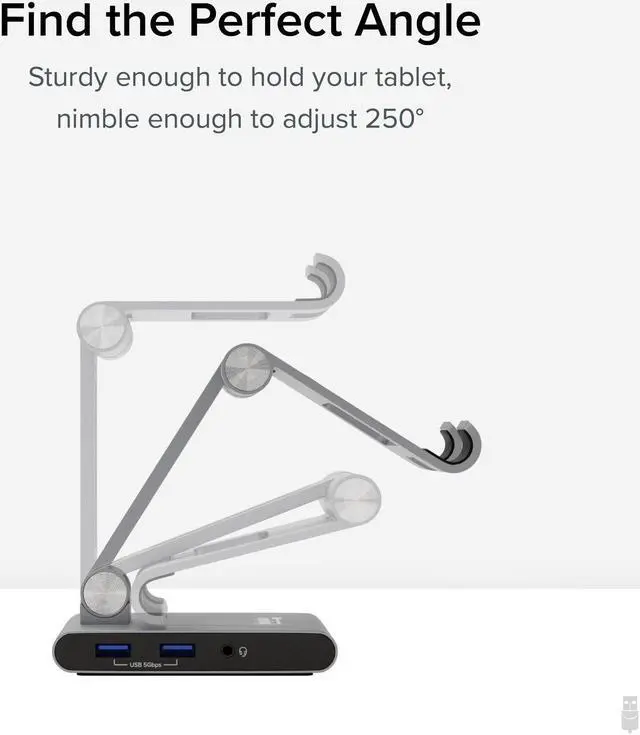 Hub and Stand in One As a hub, you get port expansion. As a stand, you get solid aluminum construction that manages to be incredibly durable and still light enough to carry with you. But dont let its potential for portability fool you, the UDS-7IN1 still has enough heft to hoist your iPad Pro 12.9. And the feeling of quality continues through to the hinges, too. With enough tension to stay put when you tap away at the screen, you might be surprised by the satisfying slide you experience when adjusting the stand for the perfect angle. And if you do decide to take it with you, the UDS-7IN1 folds flat enough to fit in your bag.