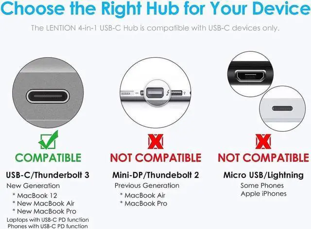 MacBook 12", MacBook Pro 13" & 15" (2018 New Mac Air) with Thunderbolt 3 ports, ChromeBook, Dell, HP, Lenovo, Acer, Asus and more with USB-C port computers, laptops, tablets and phones.