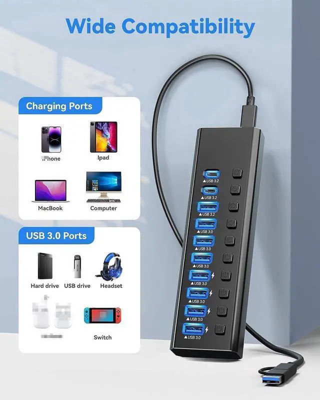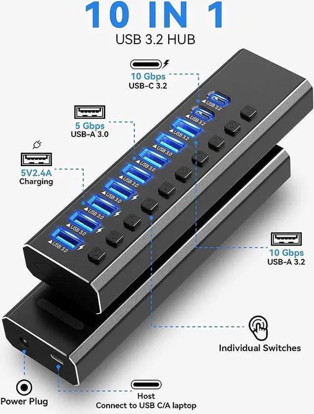 10-Port USB 3.2 /USB C Hub (USB-A 3.2 +2 USB-C 3.2 +7 USB 3.0 Ports)