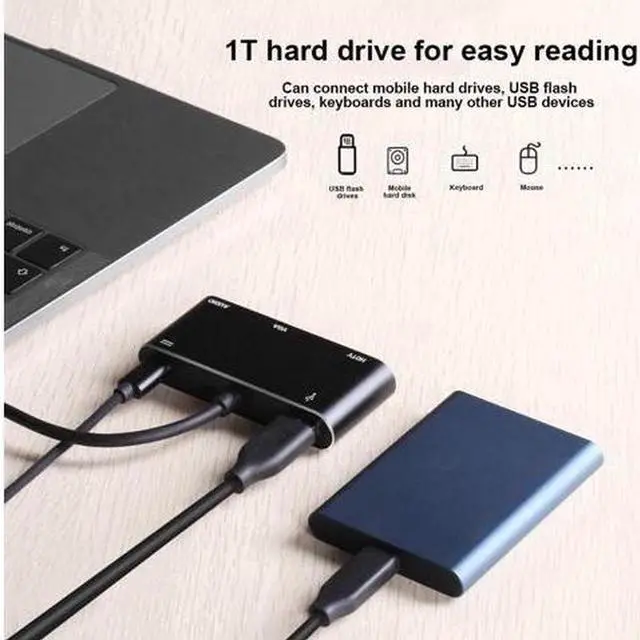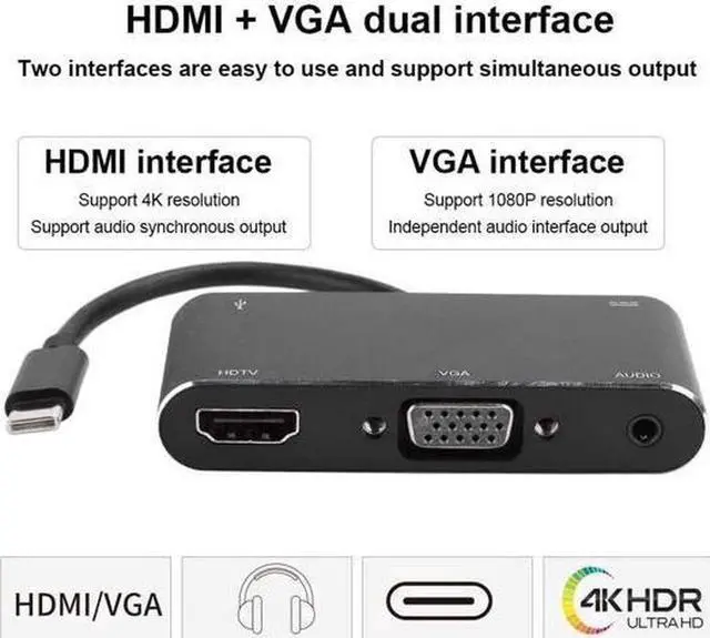 USB Docking Station, Type-C Docking Station Support HD 4K 1080P Resolution for Mobile Phone Computer, Interface for HDMI/VGA 3.2 mm Audio/USB 3.0 /YSB-CCan connect with HDMI, VGA interface, 3.2 mm audio, USB 3.0, YSB-C. HDMI + VGA dual interface, two interfaces are easy to use and support simultaneous output. The mobile phone is connected to a large-screen TV / display, and it is more fun to play games. HDMI interface, support 4K resolution, support audio synchronous output. VGA interface, support 1080P resolution, independent audio interface output.