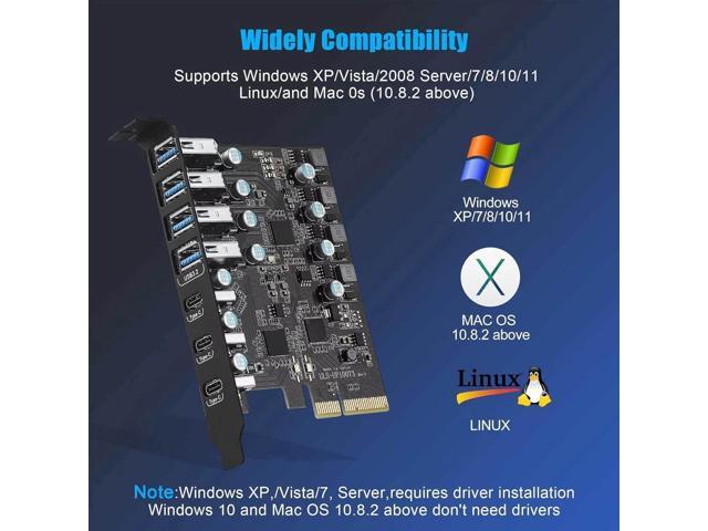 - Wide Compatibility: Support Windows 10/8/7/XP/Server, Linux and Mac OS 10.8.2(and higher). USB card are PCIe 3.0 and PCIe 2.0 compliant motherboards for PCI Express x4, x8, or x16 slots. Note: Windows 7/XP/Vista/Server, need to install the driver, Windows 10 and Mac OS 10.8.2 or above most don't need the driver.