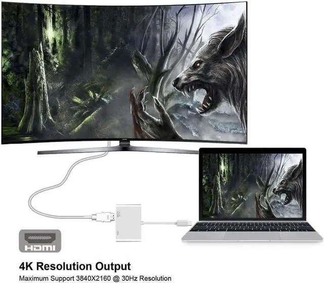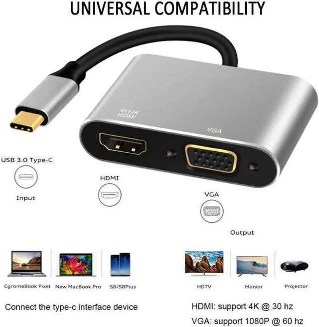 Support 4K Max: USB C to HDMI-compatible VGA Adapter Supports video resolution up to (4K * 2K) at 3840 * 2160P / 30Hz. when use HDMI-compatible alone, It support a large screen liquid crystal TV or display compatible with 4K max output.