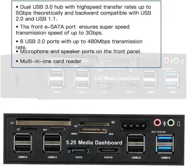 Packagelist: 1 * 5.25" Internal SATA e-SATA two USB 3.0 Six USB 2.0 Five-in-one Card Reader Multi-Function Front Panel Media Dashboard 4 * Screw 1 *