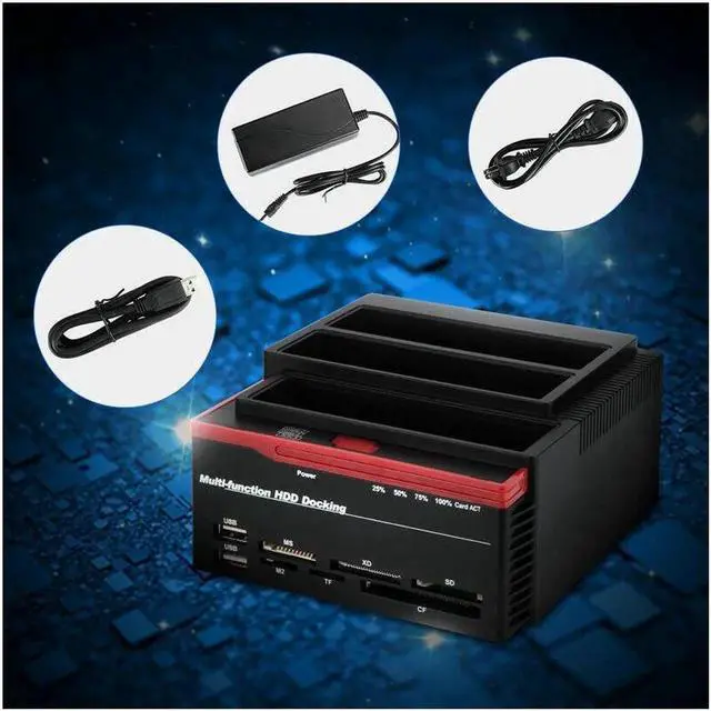 Features: * 3 slots triple docking (2 x SATA slot and 1 x IDE slot). Clone function. 2 ports USB 2.0 Hub. MS/M2/XD/CF/SD/TF card reader. * Compliant with serial ata
