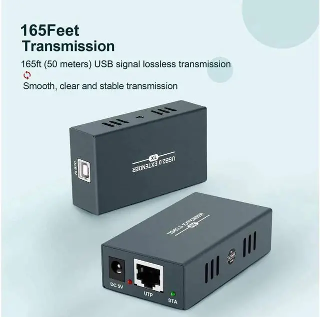 USB 2.0 Extender 165ftUSB Extender over single Cat5e/Cat6/Cat7 cable max up 50 meters. Support 4 USB 2.0 ports. USB 2.0 high-speed transmission (up to 480Mbps). Only one power adapter is needed.
