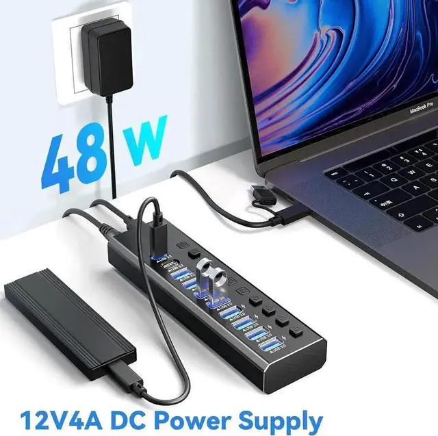 USB Port Expansion & SuperSpeed Syncing: Instantly expand 1 USB port to 10 external USB 3.0 A/C data ports for keyboard, mouse, printer, hard drivers, USB Flash drive and more USB devices. Synchronizing data at speeds up to 5Gbps, this powered USB 3.0 hub can transfer files and data in a flash. Say goodbye to not having enough computer jacks and slow data transfers.