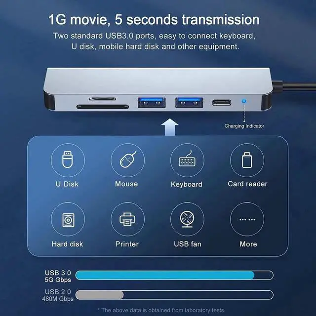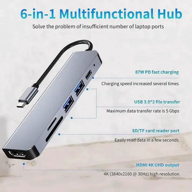 6 in 1 USB C Hub, USB Docking Station with 4K HDMI, 2 USB 3.0, SD Slot, TF Slot, Type C PD Port, Ultra Slim Aluminum Portable Data Hub
