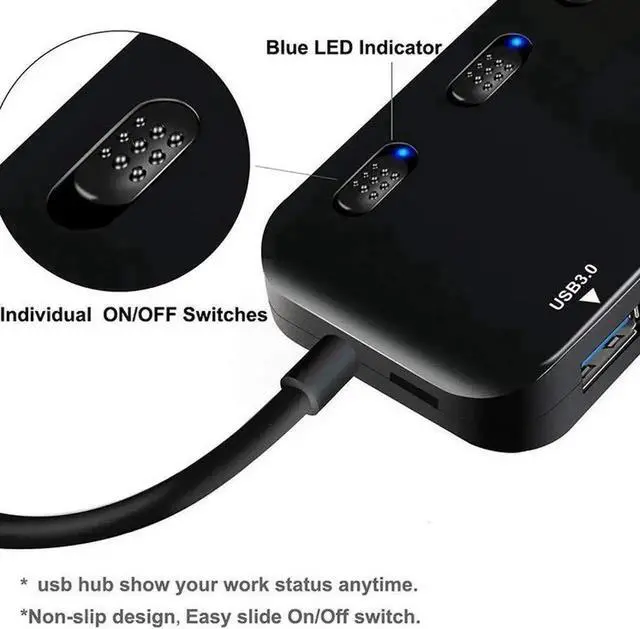 USB 3.0 Hub Splitter - USB Extender 4 Port USB Ultra Slim Data Hub with Individual Power Switch and LED