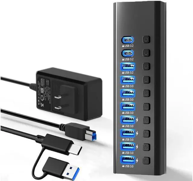 10-Port Hybrid Powered USB 3.2 /USB C Hub48W with 10Gbps USB-A 3.2, 2 USB-C 3.2, 7 USB 3.0 Data Ports, Aluminum USB Splitter with Individual On/Off Switches for Laptop, Mac, PC, Mobile HDD, Mulitple Devices