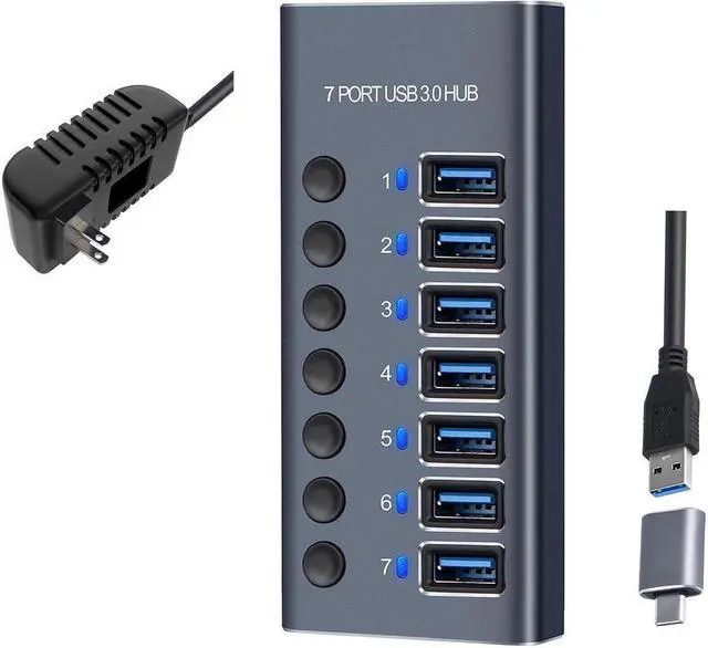Fast Data Transfer: USB 3.0 hub 7 port powered expansion delivers data speeds of up to 5 Gbps, 10x faster than USB 2.0, allowing you to transfer HD movies and photos, videos and music in seconds, without drivers. Powered USB Hub made of high-quality aluminum alloy, Plug and play, no drivers are required, fit for office, home and school.