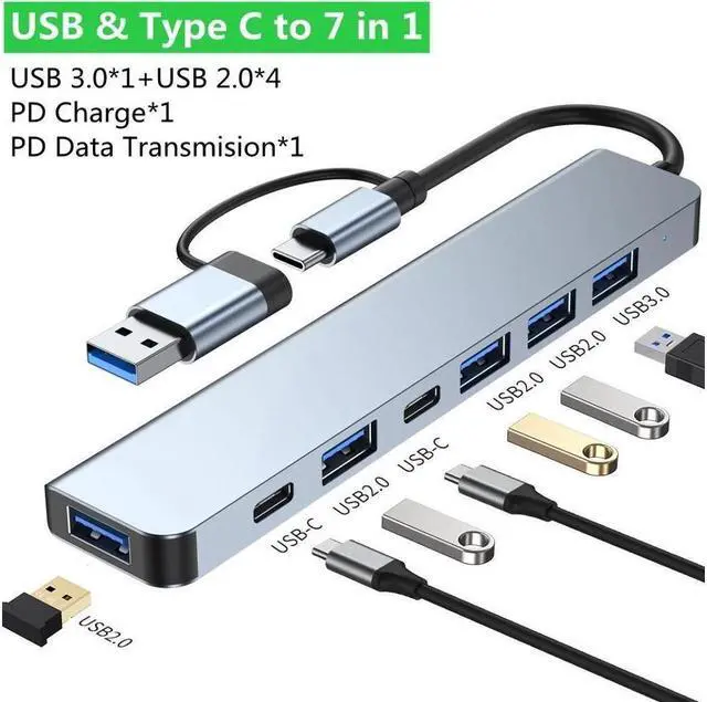 Multiports Hub: USB Hub Extender and USB Splitter instantly expands your laptop, tablet, or smartphone's connectivity with 7 essential ports, including 1 x USB 3.0 port and 4 x USB 2.0 ports, 2 x USB C 2.0 ports. Allowing you to connect various usb and usb-c devices and peripherals for increased productivity to meet your needs.