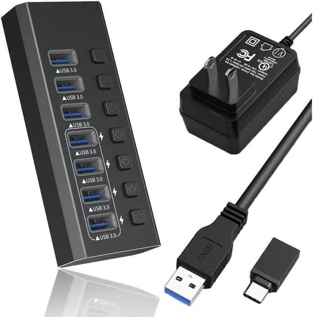 USB Expander Hub: Say goodbye to insufficient interfaces. 7 devices just need 1 powered USB hub! With this aluminum USB hub 3.0 powered, easily expand 1 port on your laptop/desktop to 7 USB 3. 0 data ports and 4 fast charging ports. 4 high speed charging ports use BC 1.2 technology to provide power at up to 2.2A current speeds. This powered USB hub 3.0 helps you charge for iPhone, iPad, and Android smartphones simultaneously without finding an extra wall outlet