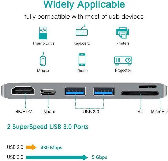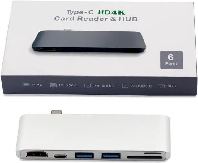 6 in 1 Thunderbolt to USB C Hubs Adapter can support high speed data transmission, pass-through charging, microSD / SD card reader, and have two USB 3.0 extension ports.