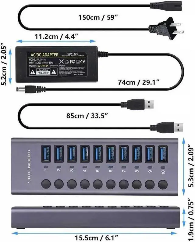 12V/5A AC Adapter Equipped: The USB 3.0 hub powered is equipped with a separate 60W 12V / 5A power adapter, stable power can be supplied even when using multiple HDDs, please use the power adapter to assure stable data transmission.