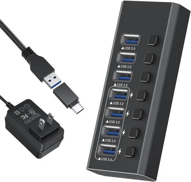 Ports Powered USB Hub: Powered USB hub can expand your laptop or desktop from a single USB-A/C port to 7 USB-A 3.0 with 4 smart-charging ports, make data transfer and charging more convenient. Your computer can simultaneously connect devices such as a keyboard, mouse, hard drive case, card reader, etc and charge your cell phones or tablets.