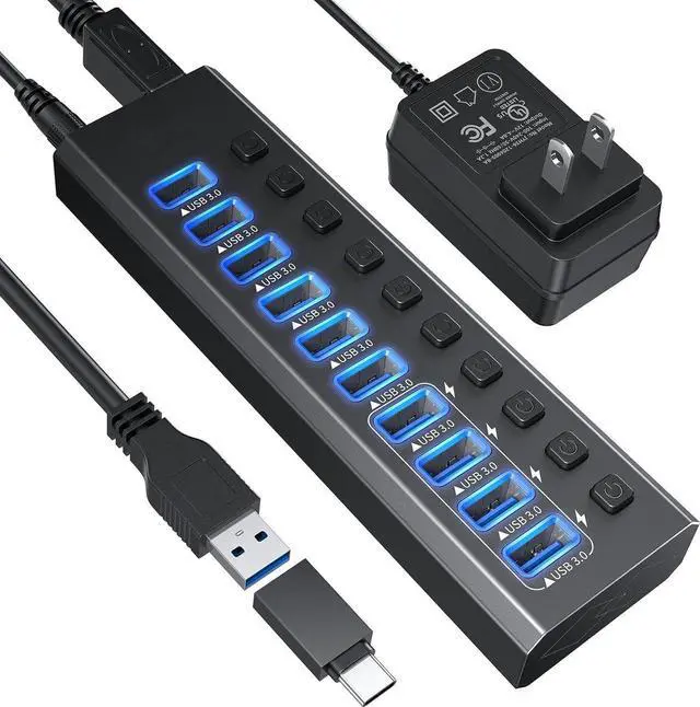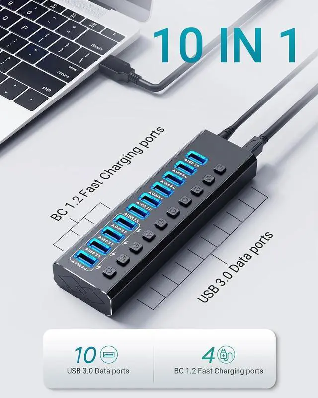 Ports Powered USB Hub: Powered USB hub can expand your laptop or desktop from a single USB-A/C port to 10 USB-A 3.0 with 4 smart-charging ports, make data transfer and charging more convenient. Your computer can simultaneously connect devices such as a keyboard, mouse, hard drive case, card reader, etc and charge your cell phones or tablets.