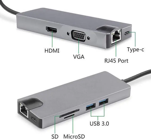 Support Standard Type-C interface, Support gigabit transmission, HDMI interface maximum support 3840*2160/30HZ, The maximum resolution of VGA is 1080P, The HDMI + VGA interface Can't usb simultaneously, Dual U3 support data transmission, built-in PD chip, Can built-in PD chip to recharge a computer with a PD charging function, Support Face and back insert, Fast heat dissipation, high quality aluminum alloy shell, better texture.