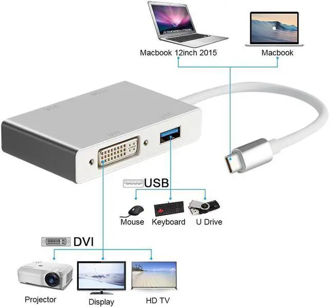 USB C to HDMI/DVI/VGA Adapter provides an easy and cost-effective solution to connect a USB C equipped notebook or desktop to HDMI, VGA or DVI enabled monitor or projector for high-definition video streaming. Extend your working desktop with mirroring or extending display to enhance work efficiency. Sync image with two displays to gives you a convenient visual enjoyment. Ideal for office, conference, home theater entertainment!
