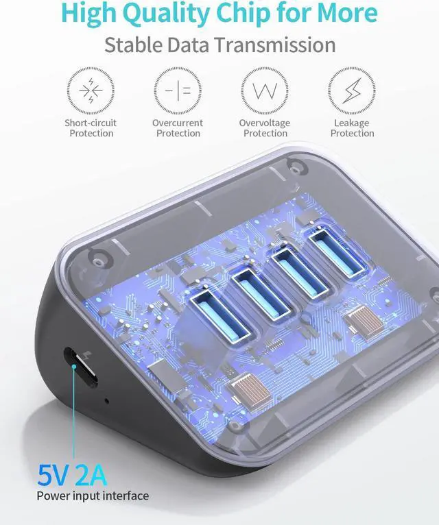 Safe, Stable & Anti-interference - Built-in industrial grade chip avoids overcurrent, overvoltage, short circuit and high temperature. Excellent effect on EMI, ESD, 2.4G and WIFI anti-interference shielding. With a 5V2A USB-C power input interface to ensure stable data transmission (The power adapter is not included, this is a data hub not recommended for charging).