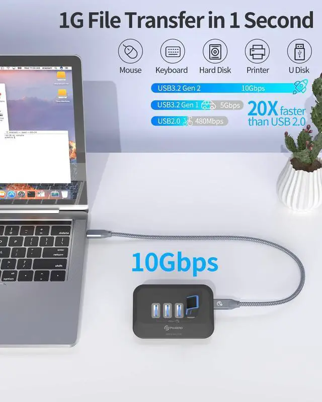 10Gbps Super Speed - USB Splitter 4 Ports supports super faster data transfer up to 10Gbps, 20X faster than USB 2.0, which allows you to transfer HD movies or large files in seconds. The great choice for game player and video workers.